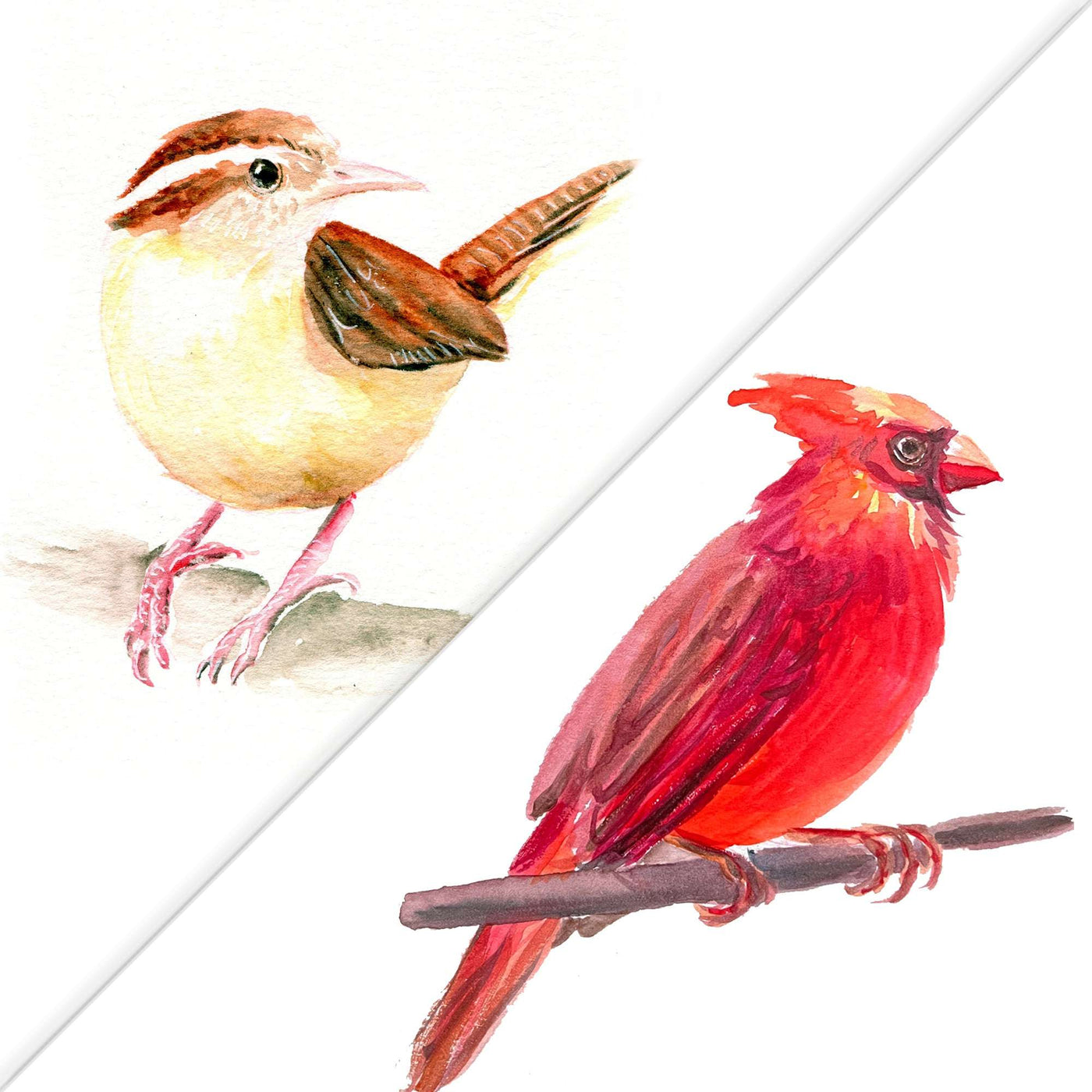 Watercolor painting of two birds, a beige finch and a vibrant red cardinal, perched and alert.