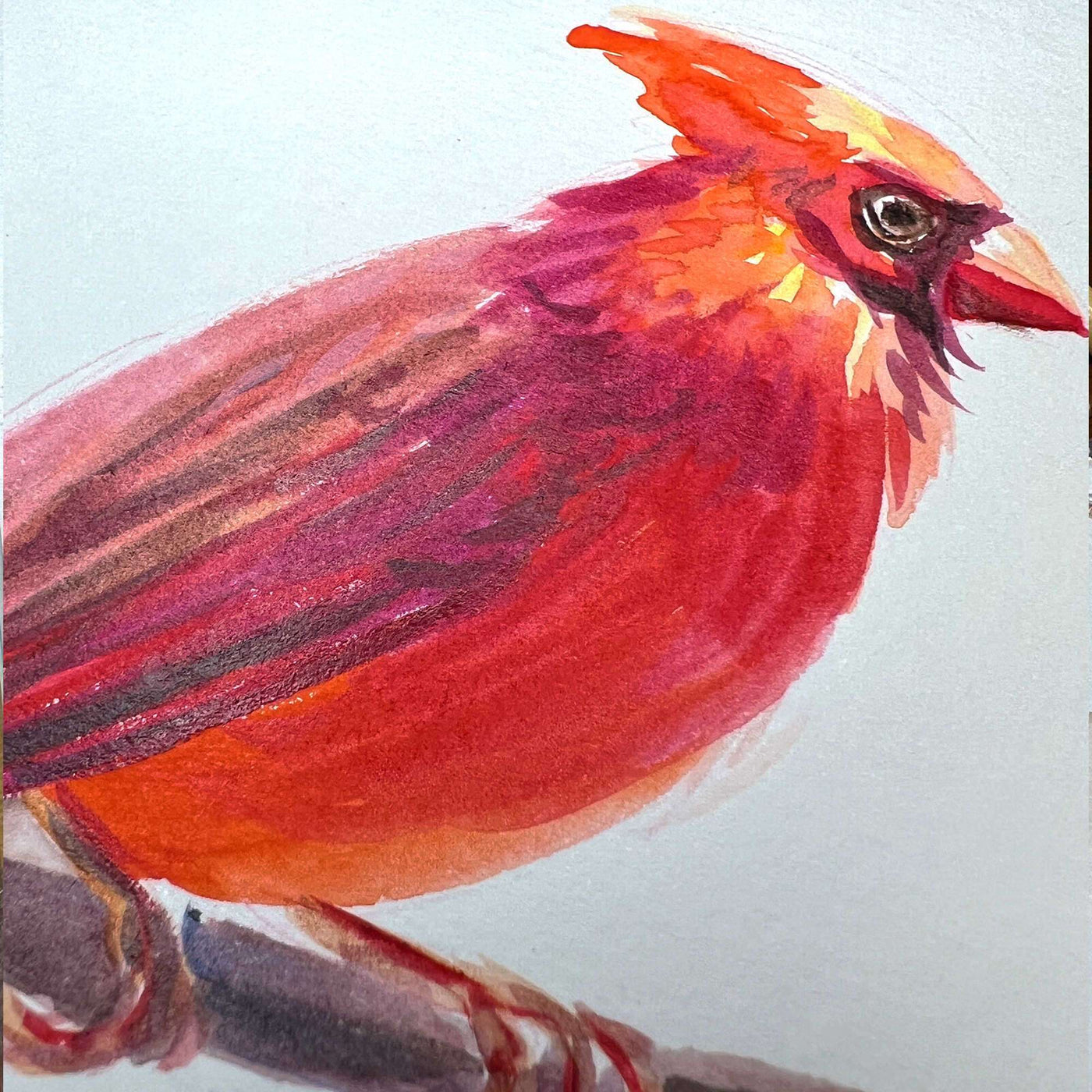 Detailed close-up of a watercolor cardinal's fiery red feathers and keen gaze
