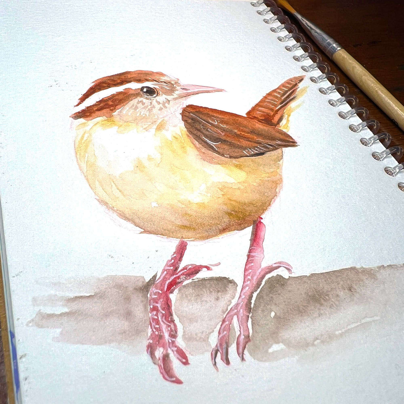 Watercolor of a finch with brown plumage and inquisitive eyes on a white sketch book page