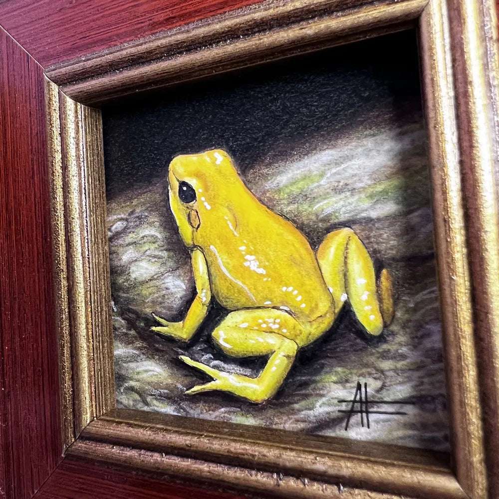 Angled close-up of a miniature yellow frog painting in a vintage golden frame.