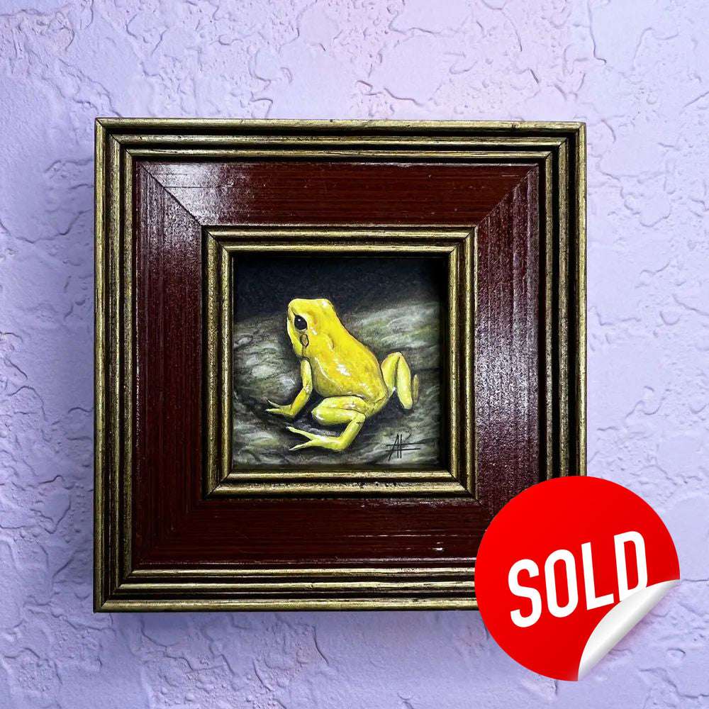 Golden-framed watercolor of a vibrant yellow frog with "SOLD" sticker on textured wall.