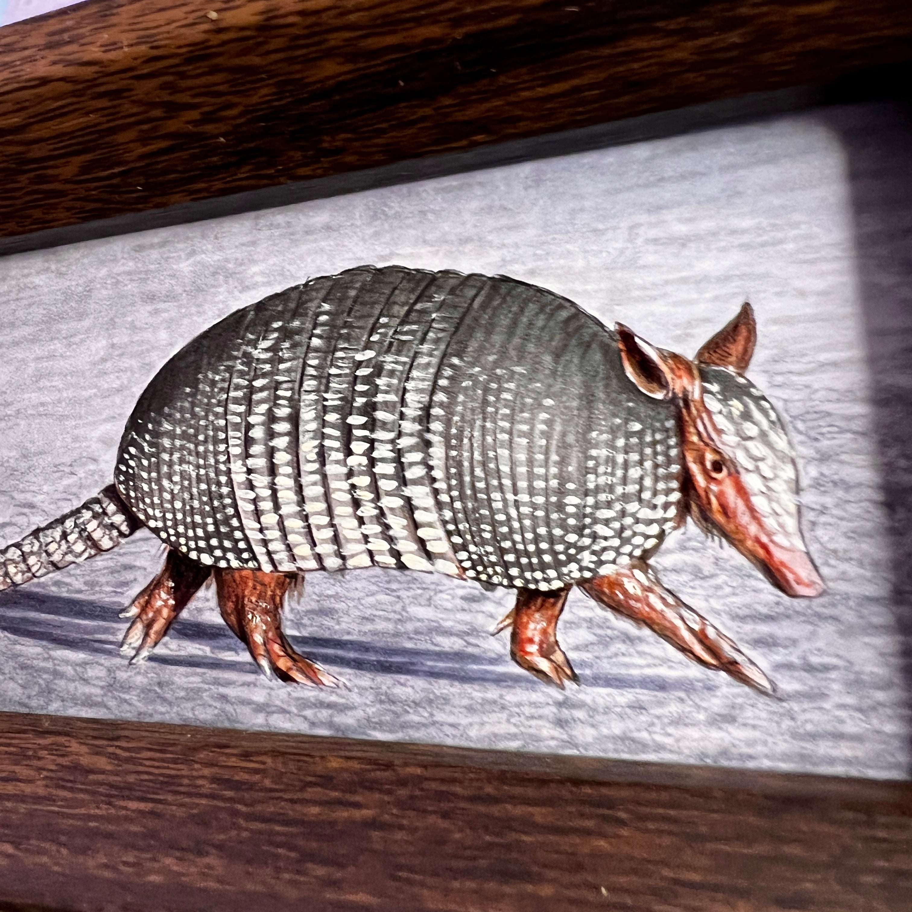 Detailed close-up of armadillo painting with scaled texture, in a dark wood frame.