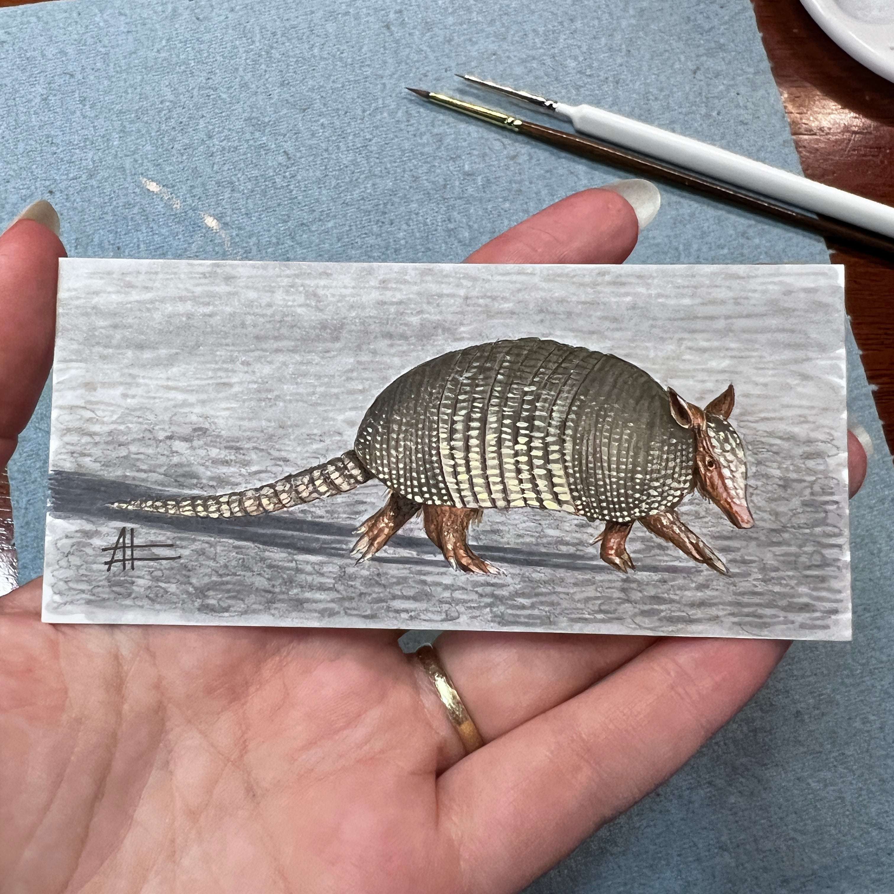 Miniature armadillo painting held in hand, showcasing detailed scale texture.