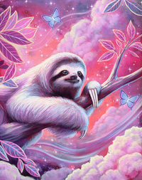 A vibrant mix of purples, pinks, and blues makes this piece a magical focal point for any space, perfect for animal lovers, sloth fans, and stargazers alike.